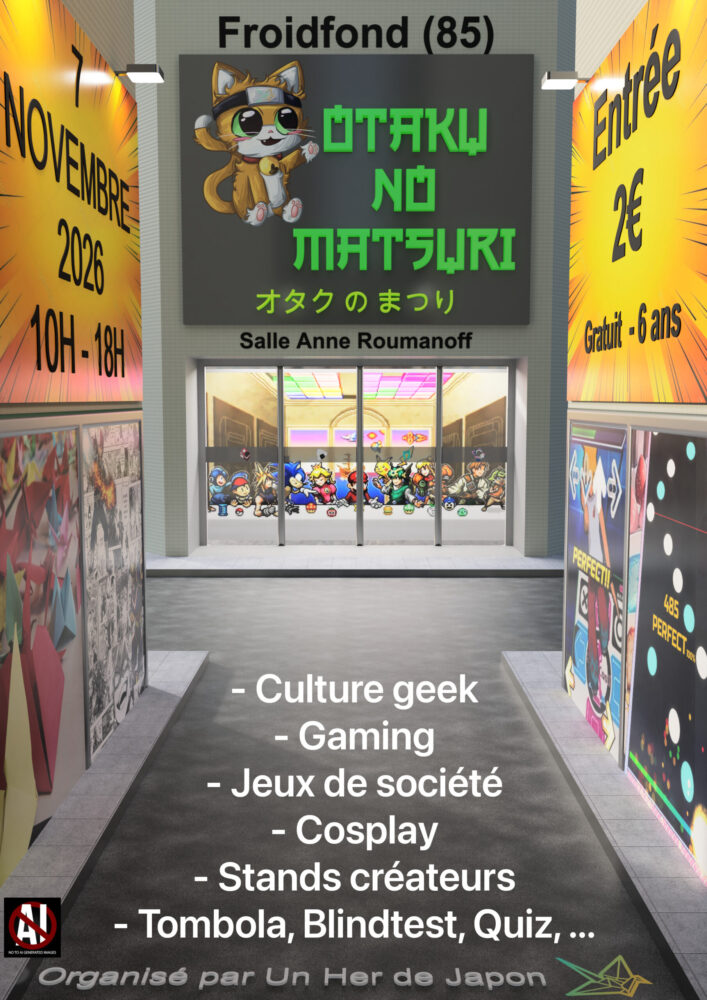 Simple otaku ou amateur de surprises et de bonne ambiance, notre Otaku-No-Matsuri vous offrira des moments conviviaux et familiaux. L’occasion parfaite de faire des rencontres, partager des rires et vivre des moments palpitants. Rejoignez-nous pour une journée riche en émotions. Culture geek, Gaming, Jeux de société, Cosplay, Stands créateurs, Tombola, Blindtest, Quizz,etc.